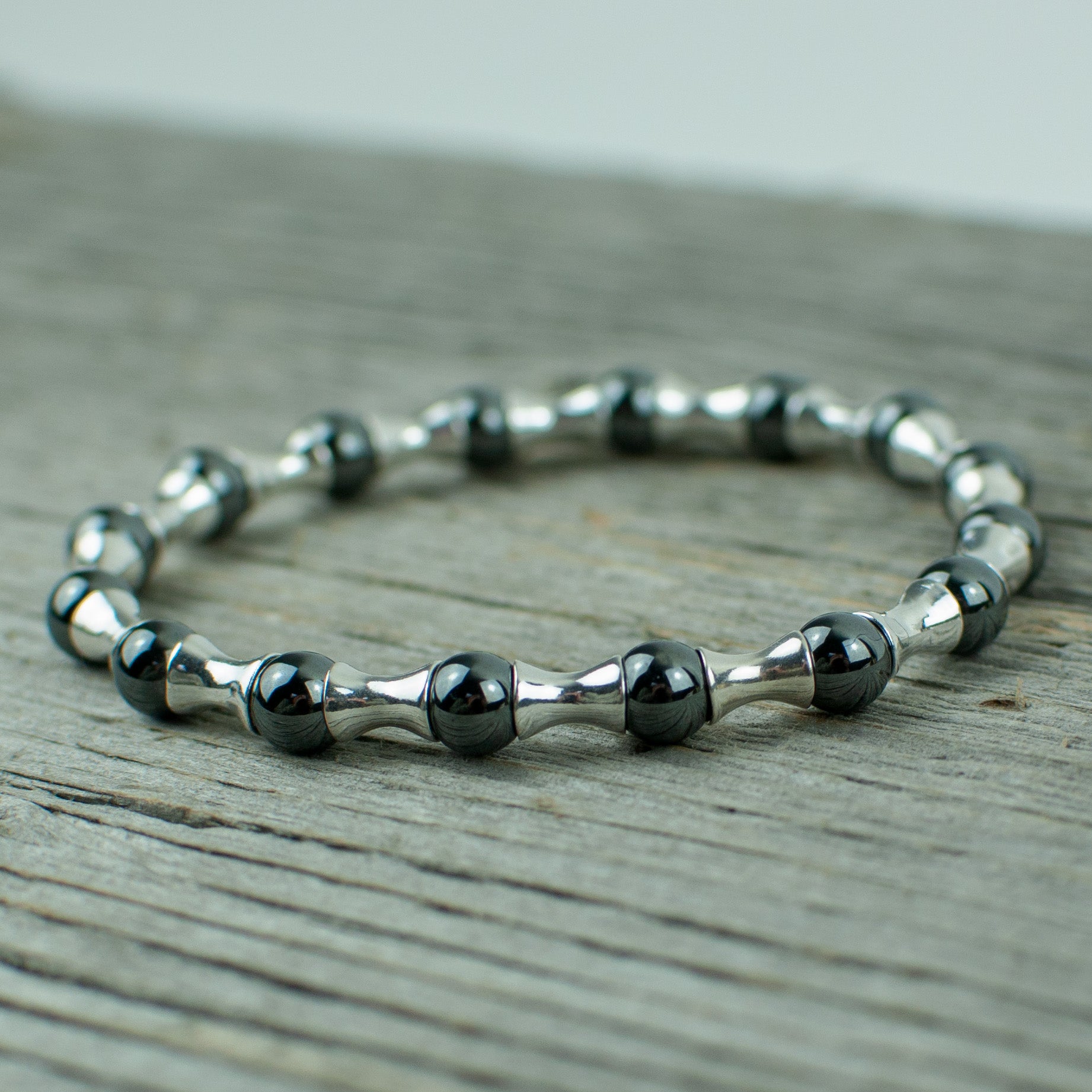 It is made from hematite and sterling beads. Beads are 6 mm in size.