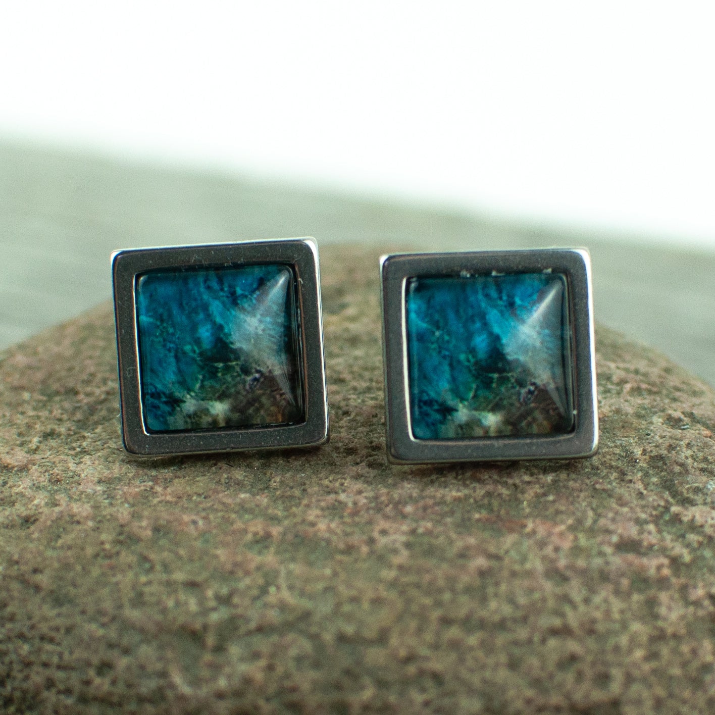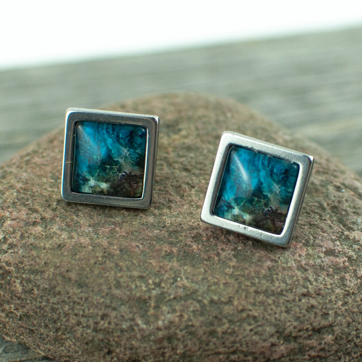 Stainless steel 10mm square stud earrings with rich blue and brown pattern under glass