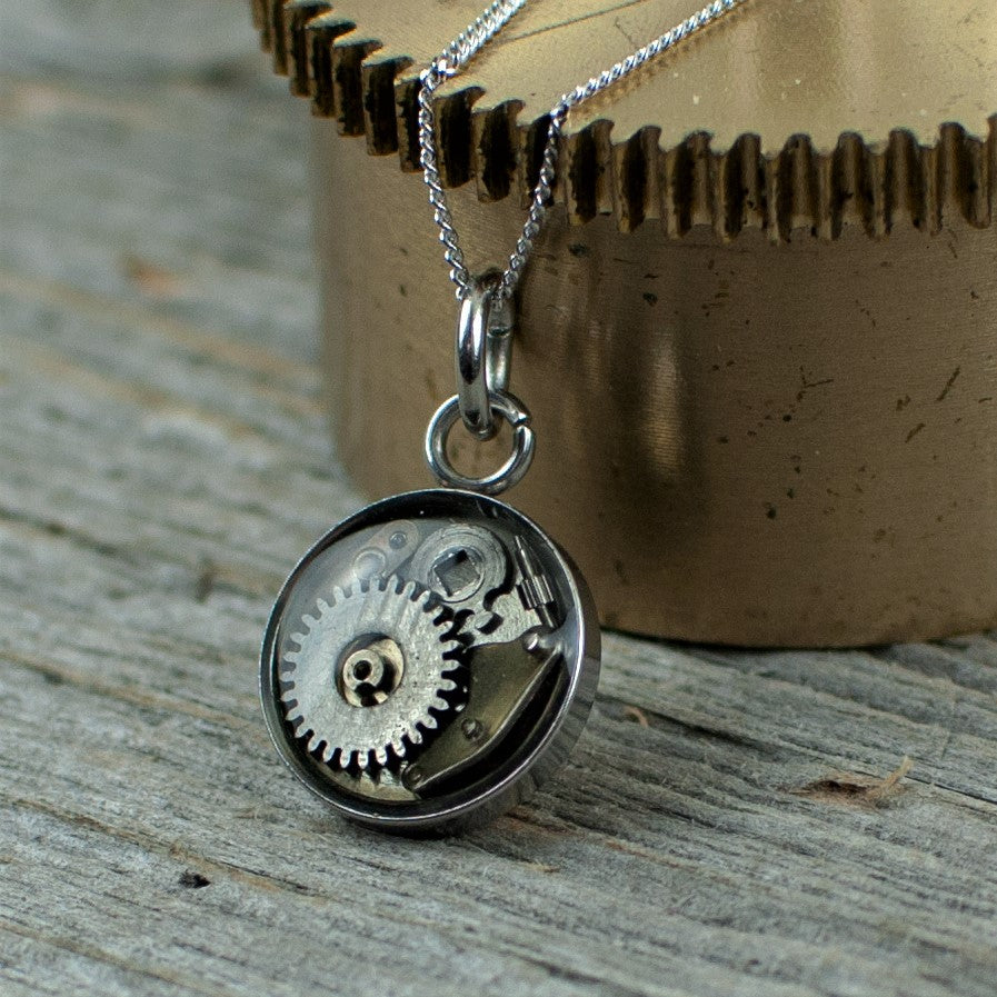 This necklace is made from mini vintage watch gears set in resin on a stainless steel disc.